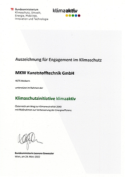 Das Klimaschutzministerium zeichnete am Donnerstag, den 24. März 2022, im Rahmen des ersten Austrian Sustainability Summits 20 heimische Unternehmen für ihr außerordentliches Engagement in Sachen Energieeffizienz aus. Unter den prämierten Betrieben findet sich auch die MKW Kunststofftechnik GmbH wieder.
